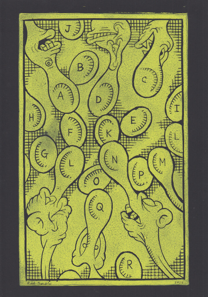 New Trembles linocut print ALPHABET SOUP! At 11.1/4 X 8.1/4 inches, it’s larger than my previous ones so these are $20 each. Yellow ink on black card-stock, signed & dated. Some available on blue card. Outta-towners: postage not included so private-message me for deets. Stay tuned for new designs coming soon!
