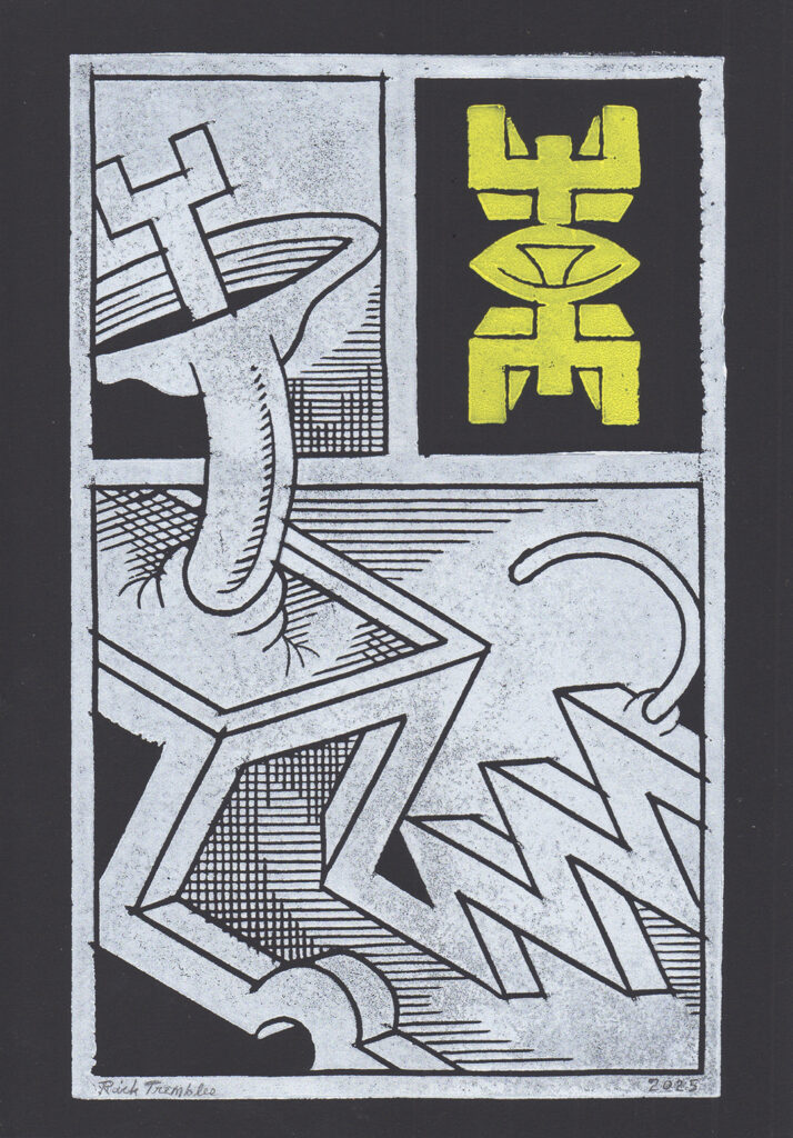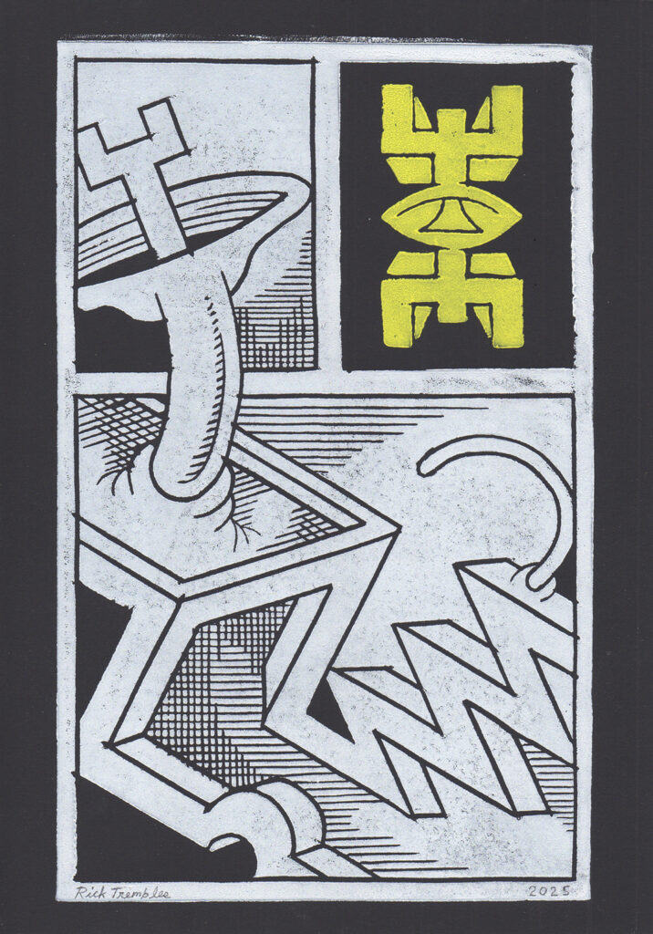 New Trembles linocut prints PLAYTIME ONE & TWO (naming these for cataloging purposes). White & yellow ink on black cardstock, signed & dated. Variants also available with the yellow part upside down making it look more frowny than smiley! All individually hand-printed from carved blocks so each one is unique! At 11.1/4 X 8.1/4 inches, it’s larger than my previous ones so these are $20 each. Outta-towners: postage not included so private-message me for deets.