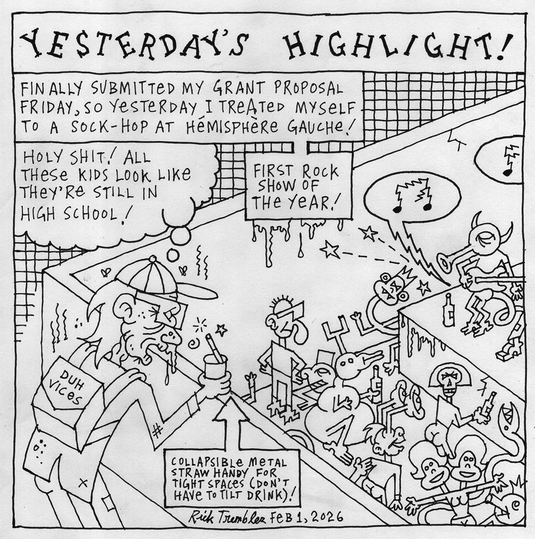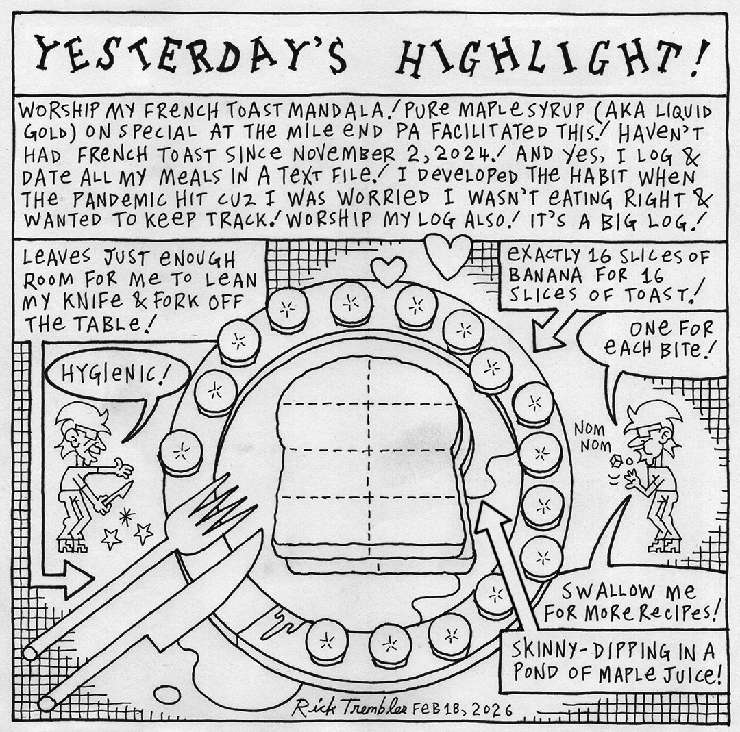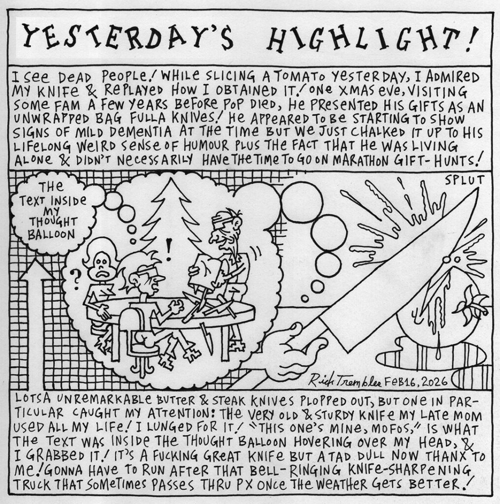 Brand new 32-page Rick Trembles mini-comic “YESTERDAY’S HIGHLIGHT”! 5 bucks! If you see me around just ask me for one, I’ll have some in my backpack! Canada snail-mail, add a dollar so I can buy a stamp! Outside Canada contact me for more info! PREMISE: In February I challenged myself to create one cartoon panel a day for the whole month & had to write about at least one good thing that happened the previous day! WAY easier said than done since Feb is my least fave cabin-fever month! Hilarity/desperation ensues!